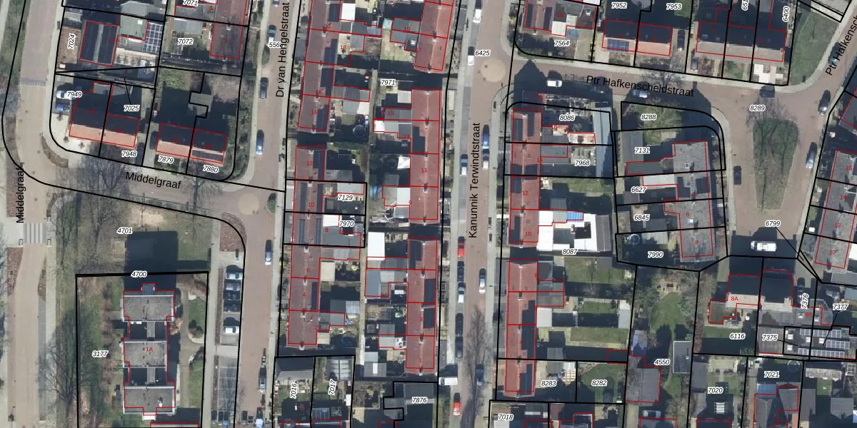 Het perceel waarop Kanunnik Terwindtstraat 9 staat heeft een oppervlakte van 4132 m². Dit is een zeer groot perceel. De perceeloppervlakte wordt geregistreerd door het Kadaster. Gedetailleerde informatie over de maten van dit perceel kunt u vinden in het rapport Kadastrale kaart met maatvoering van Kanunnik Terwindtstraat 9.