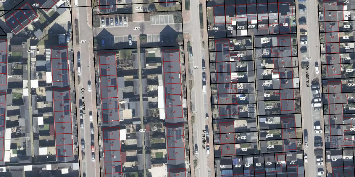Het perceel waarop Merellaan 33 staat heeft een oppervlakte van 4374 m². Dit is een zeer groot perceel. De perceeloppervlakte wordt geregistreerd door het Kadaster. Gedetailleerde informatie over de maten van dit perceel kunt u vinden in het rapport Kadastrale kaart met maatvoering van Merellaan 33.