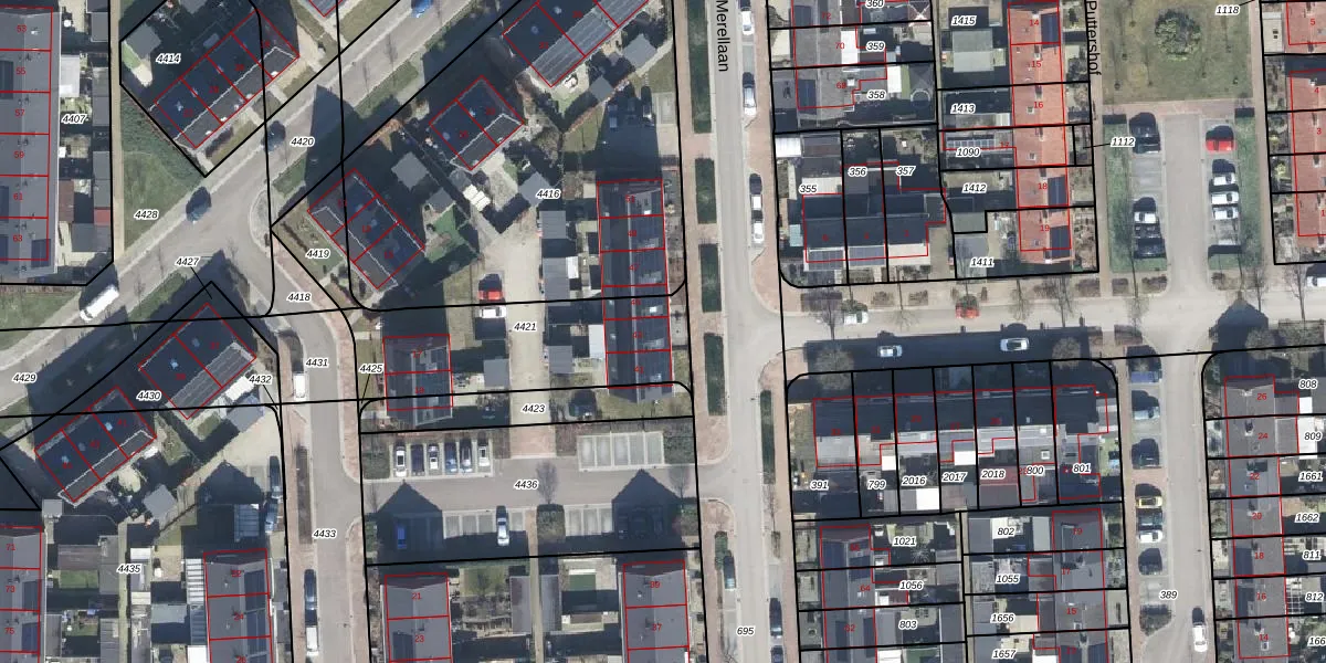 Het perceel waarop Merellaan 43 staat heeft een oppervlakte van 679 m². Dit is een groot perceel. De perceeloppervlakte wordt geregistreerd door het Kadaster. Gedetailleerde informatie over de maten van dit perceel kunt u vinden in het rapport Kadastrale kaart met maatvoering van Merellaan 43.