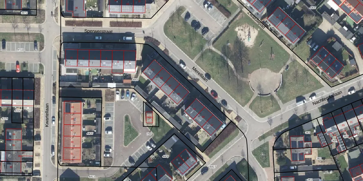 Het perceel waarop Merellaan 65 staat heeft een oppervlakte van 2440 m². Dit is een zeer groot perceel. De perceeloppervlakte wordt geregistreerd door het Kadaster. Gedetailleerde informatie over de maten van dit perceel kunt u vinden in het rapport Kadastrale kaart met maatvoering van Merellaan 65.