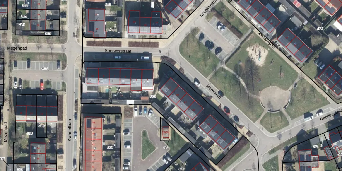 Het perceel waarop Merellaan 71 staat heeft een oppervlakte van 2440 m². Dit is een zeer groot perceel. De perceeloppervlakte wordt geregistreerd door het Kadaster. Gedetailleerde informatie over de maten van dit perceel kunt u vinden in het rapport Kadastrale kaart met maatvoering van Merellaan 71.