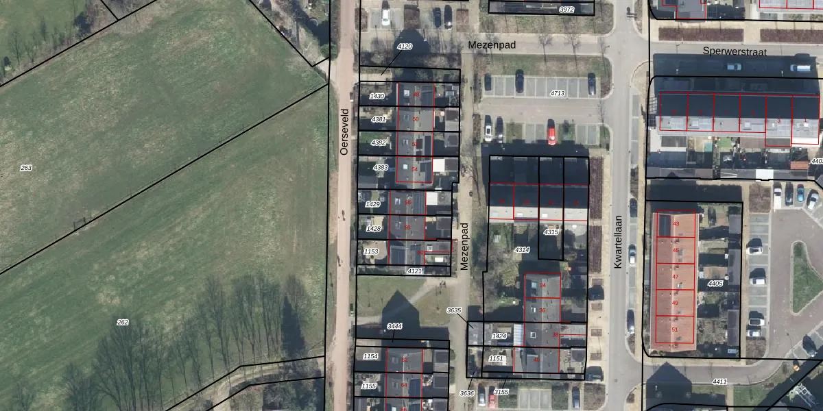 Het perceel waarop Mezenpad 56 staat heeft een oppervlakte van 141 m². Dit is een middelgroot perceel. De perceeloppervlakte wordt geregistreerd door het Kadaster. Gedetailleerde informatie over de maten van dit perceel kunt u vinden in het rapport Kadastrale kaart met maatvoering van Mezenpad 56.
