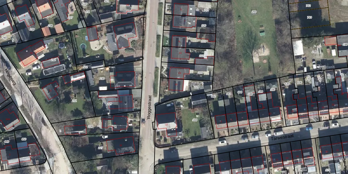 Het perceel waarop Roggestraat 15 staat heeft een oppervlakte van 303 m². Dit is een groot perceel. De perceeloppervlakte wordt geregistreerd door het Kadaster. Gedetailleerde informatie over de maten van dit perceel kunt u vinden in het rapport Kadastrale kaart met maatvoering van Roggestraat 15.