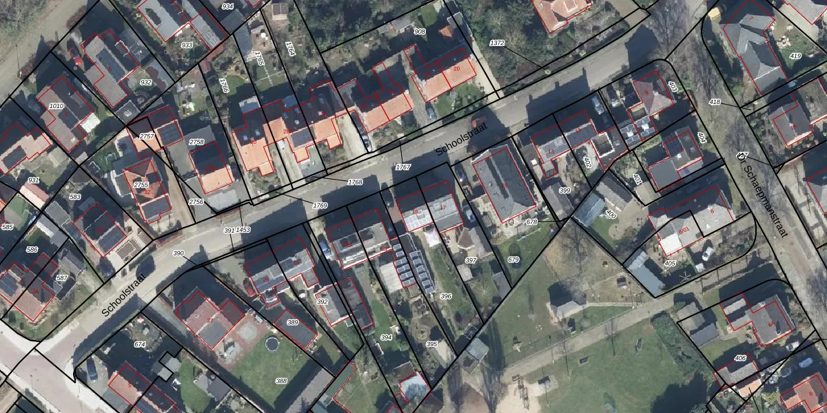 Het perceel waarop Schoolstraat 19 staat heeft een oppervlakte van 392 m². Dit is een groot perceel. De perceeloppervlakte wordt geregistreerd door het Kadaster. Gedetailleerde informatie over de maten van dit perceel kunt u vinden in het rapport Kadastrale kaart met maatvoering van Schoolstraat 19.