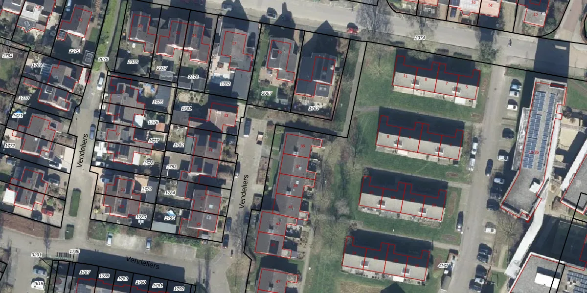 Het perceel waarop Vendeliers 35 staat heeft een oppervlakte van 1,7 ha. Dit is een zeer groot perceel. De perceeloppervlakte wordt geregistreerd door het Kadaster. Gedetailleerde informatie over de maten van dit perceel kunt u vinden in het rapport Kadastrale kaart met maatvoering van Vendeliers 35.