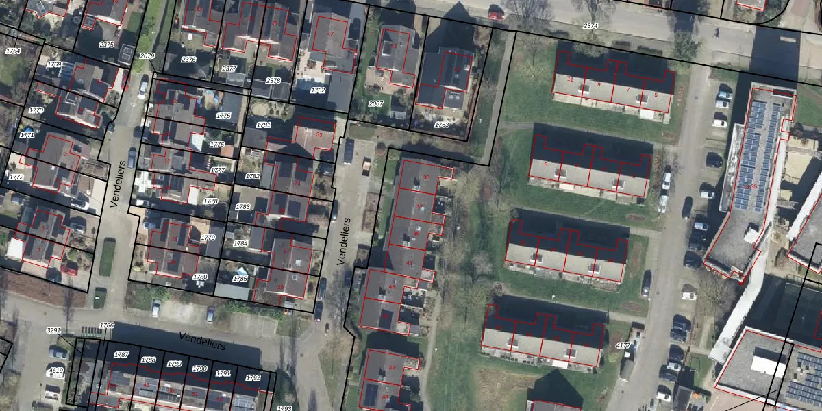 Het perceel waarop Vendeliers 37 staat heeft een oppervlakte van 1,7 ha. Dit is een zeer groot perceel. De perceeloppervlakte wordt geregistreerd door het Kadaster. Gedetailleerde informatie over de maten van dit perceel kunt u vinden in het rapport Kadastrale kaart met maatvoering van Vendeliers 37.