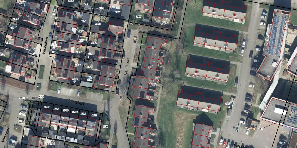 Het perceel waarop Vendeliers 41 staat heeft een oppervlakte van 1,7 ha. Dit is een zeer groot perceel. De perceeloppervlakte wordt geregistreerd door het Kadaster. Gedetailleerde informatie over de maten van dit perceel kunt u vinden in het rapport Kadastrale kaart met maatvoering van Vendeliers 41.