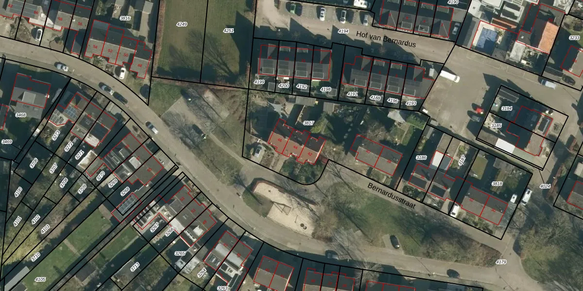 Bernardusstraat 44 is gelegen op kadastraal perceel BLE01A3817. Deze kadastrale aanduiding is uniek en wordt gebruikt door het Kadaster om eigendomsrechten en andere zakelijke rechten vast te leggen. Het perceel maakt onderdeel uit van de kadastrale gemeente Baarle-Nassau.