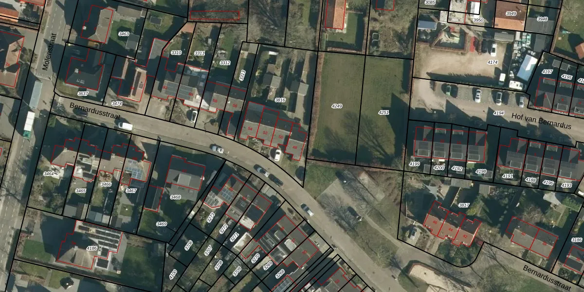 Het perceel waarop Bernardusstraat 48 staat heeft een oppervlakte van 915 m². Dit is een groot perceel. De perceeloppervlakte wordt geregistreerd door het Kadaster. Gedetailleerde informatie over de maten van dit perceel kunt u vinden in het rapport Kadastrale kaart met maatvoering van Bernardusstraat 48.