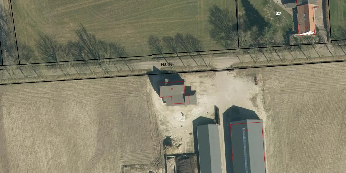 Het perceel waarop Haldijk 11 staat heeft een oppervlakte van 8,3 ha. Dit is een zeer groot perceel. De perceeloppervlakte wordt geregistreerd door het Kadaster. Gedetailleerde informatie over de maten van dit perceel kunt u vinden in het rapport Kadastrale kaart met maatvoering van Haldijk 11.