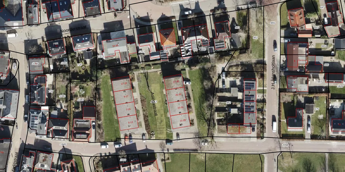 Het perceel waarop Asingastraat 35 staat heeft een oppervlakte van 3215 m². Dit is een zeer groot perceel. De perceeloppervlakte wordt geregistreerd door het Kadaster. Gedetailleerde informatie over de maten van dit perceel kunt u vinden in het rapport Kadastrale kaart met maatvoering van Asingastraat 35.