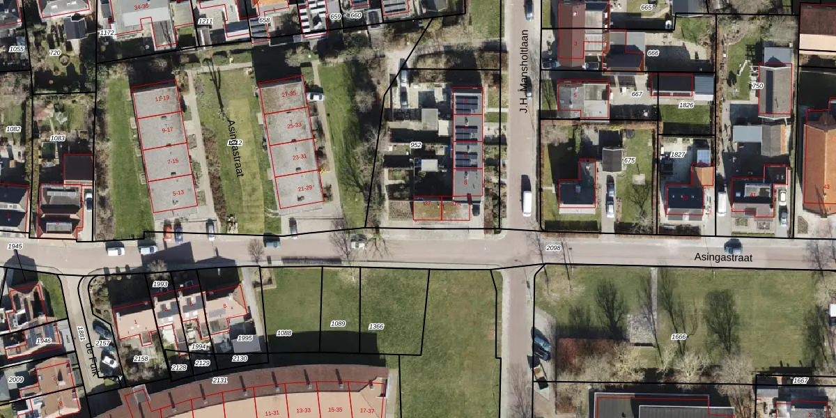 Het perceel waarop Asingastraat 37 staat heeft een oppervlakte van 1110 m². Dit is een zeer groot perceel. De perceeloppervlakte wordt geregistreerd door het Kadaster. Gedetailleerde informatie over de maten van dit perceel kunt u vinden in het rapport Kadastrale kaart met maatvoering van Asingastraat 37.