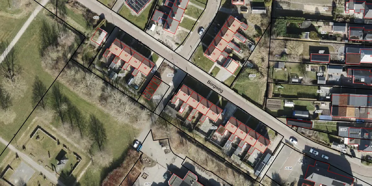 Het perceel waarop Borgweg 48 staat heeft een oppervlakte van 1709 m². Dit is een zeer groot perceel. De perceeloppervlakte wordt geregistreerd door het Kadaster. Gedetailleerde informatie over de maten van dit perceel kunt u vinden in het rapport Kadastrale kaart met maatvoering van Borgweg 48.