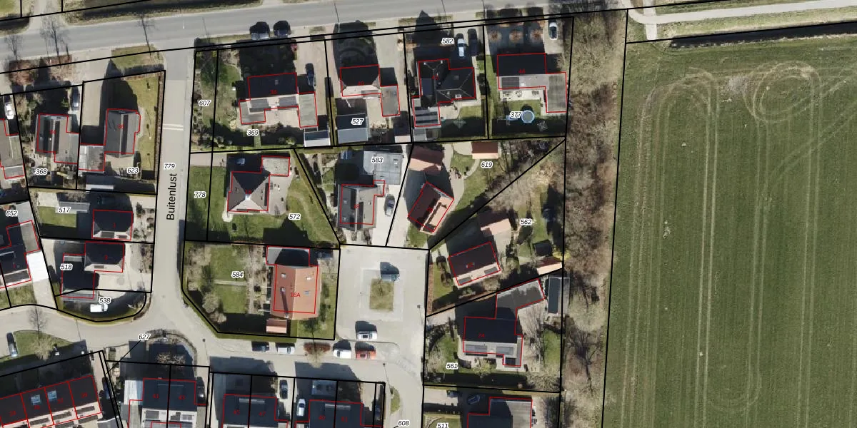Het perceel waarop Buitenlust 20 staat heeft een oppervlakte van 582 m². Dit is een groot perceel. De perceeloppervlakte wordt geregistreerd door het Kadaster. Gedetailleerde informatie over de maten van dit perceel kunt u vinden in het rapport Kadastrale kaart met maatvoering van Buitenlust 20.