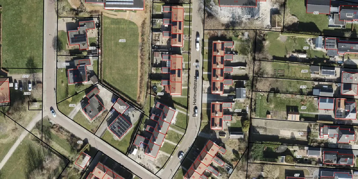 Het perceel waarop Burg. Harteveltstraat 14 staat heeft een oppervlakte van 2018 m². Dit is een zeer groot perceel. De perceeloppervlakte wordt geregistreerd door het Kadaster. Gedetailleerde informatie over de maten van dit perceel kunt u vinden in het rapport Kadastrale kaart met maatvoering van Burg. Harteveltstraat 14.