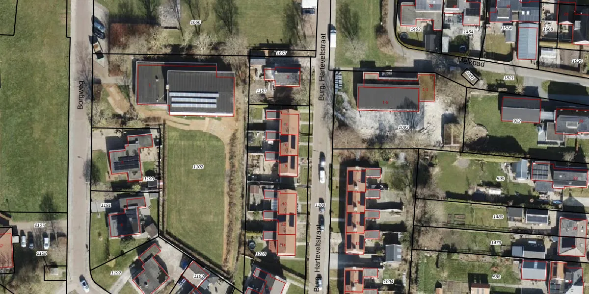 Het perceel waarop Burg. Harteveltstraat 6 staat heeft een oppervlakte van 2018 m². Dit is een zeer groot perceel. De perceeloppervlakte wordt geregistreerd door het Kadaster. Gedetailleerde informatie over de maten van dit perceel kunt u vinden in het rapport Kadastrale kaart met maatvoering van Burg. Harteveltstraat 6.