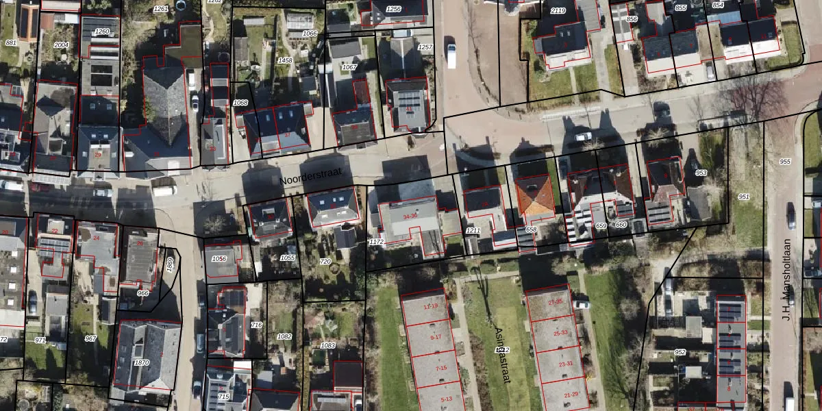 Het perceel waarop Noorderstraat 34 staat heeft een oppervlakte van 453 m². Dit is een groot perceel. De perceeloppervlakte wordt geregistreerd door het Kadaster. Gedetailleerde informatie over de maten van dit perceel kunt u vinden in het rapport Kadastrale kaart met maatvoering van Noorderstraat 34.