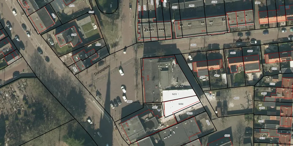 Het perceel waarop Dorpsplein 13 staat heeft een oppervlakte van 900 m². Dit is een groot perceel. De perceeloppervlakte wordt geregistreerd door het Kadaster. Gedetailleerde informatie over de maten van dit perceel kunt u vinden in het rapport Kadastrale kaart met maatvoering van Dorpsplein 13.