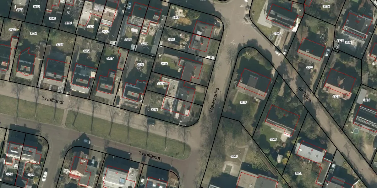 Het perceel waarop Weversdries 12 staat heeft een oppervlakte van 322 m². Dit is een groot perceel. De perceeloppervlakte wordt geregistreerd door het Kadaster. Gedetailleerde informatie over de maten van dit perceel kunt u vinden in het rapport Kadastrale kaart met maatvoering van Weversdries 12.