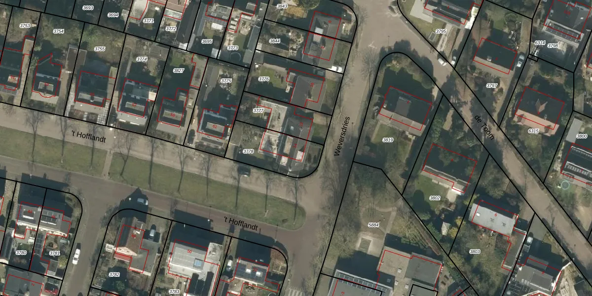 Het perceel waarop Weversdries 14 staat heeft een oppervlakte van 406 m². Dit is een groot perceel. De perceeloppervlakte wordt geregistreerd door het Kadaster. Gedetailleerde informatie over de maten van dit perceel kunt u vinden in het rapport Kadastrale kaart met maatvoering van Weversdries 14.