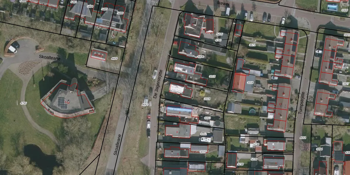 Het perceel waarop De Jagerstrjitte 5 staat heeft een oppervlakte van 448 m². Dit is een groot perceel. De perceeloppervlakte wordt geregistreerd door het Kadaster. Gedetailleerde informatie over de maten van dit perceel kunt u vinden in het rapport Kadastrale kaart met maatvoering van De Jagerstrjitte 5.