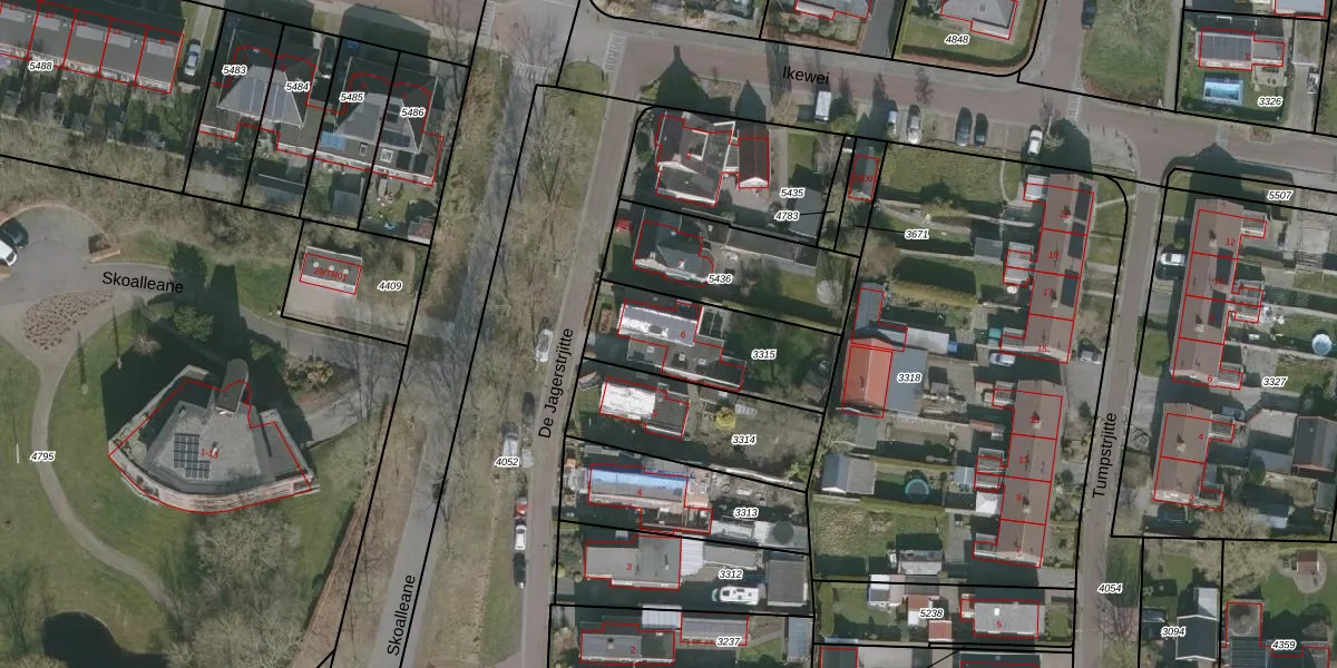 Het perceel waarop De Jagerstrjitte 6 staat heeft een oppervlakte van 447 m². Dit is een groot perceel. De perceeloppervlakte wordt geregistreerd door het Kadaster. Gedetailleerde informatie over de maten van dit perceel kunt u vinden in het rapport Kadastrale kaart met maatvoering van De Jagerstrjitte 6.