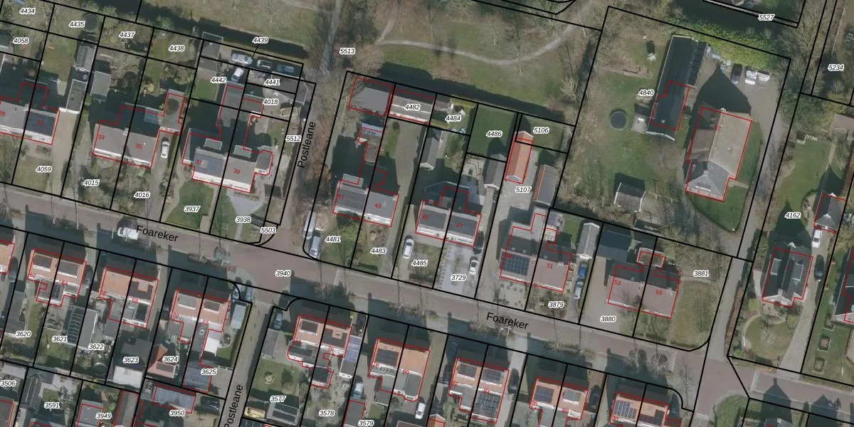 Het perceel waarop Foareker 45 staat heeft een oppervlakte van 369 m². Dit is een groot perceel. De perceeloppervlakte wordt geregistreerd door het Kadaster. Gedetailleerde informatie over de maten van dit perceel kunt u vinden in het rapport Kadastrale kaart met maatvoering van Foareker 45.