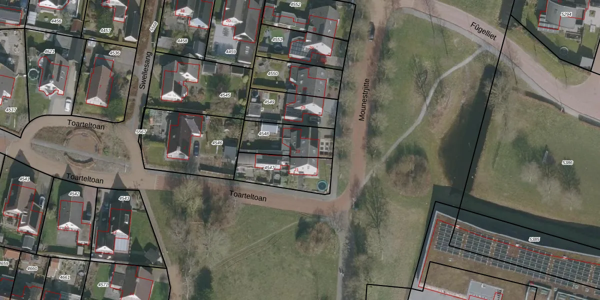 Het perceel waarop Mounestrjitte 23 staat heeft een oppervlakte van 322 m². Dit is een groot perceel. De perceeloppervlakte wordt geregistreerd door het Kadaster. Gedetailleerde informatie over de maten van dit perceel kunt u vinden in het rapport Kadastrale kaart met maatvoering van Mounestrjitte 23.