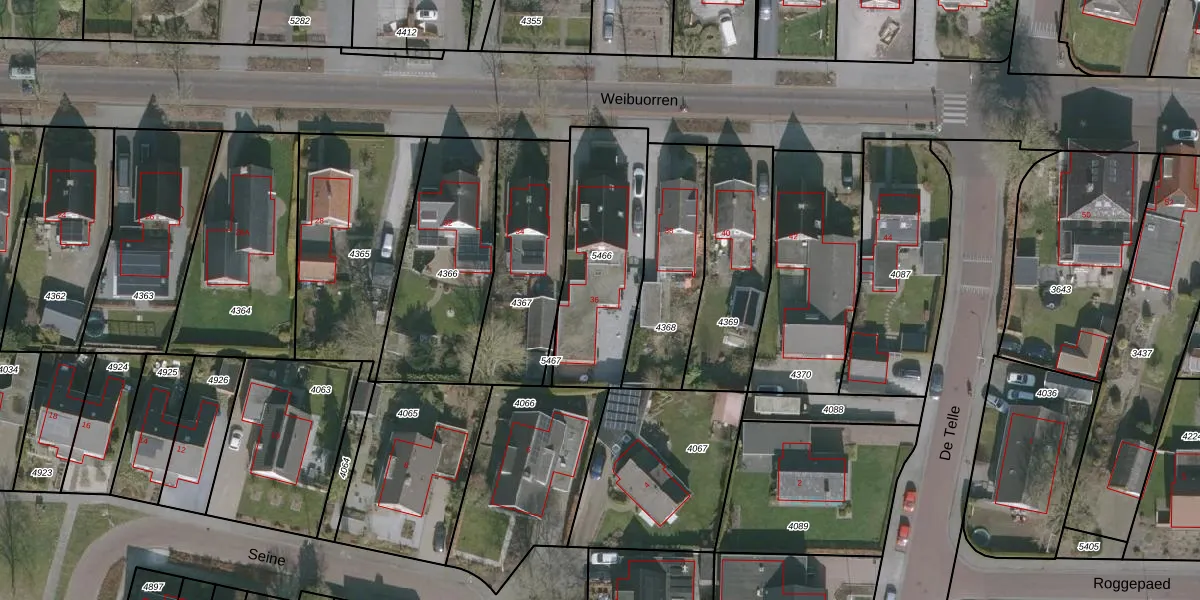 Het perceel waarop Weibuorren 36 staat heeft een oppervlakte van 540 m². Dit is een groot perceel. De perceeloppervlakte wordt geregistreerd door het Kadaster. Gedetailleerde informatie over de maten van dit perceel kunt u vinden in het rapport Kadastrale kaart met maatvoering van Weibuorren 36.