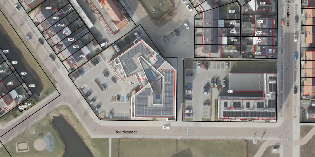 Beatrixstraat 39-e is gelegen op kadastraal perceel URK00C4422. Deze kadastrale aanduiding is uniek en wordt gebruikt door het Kadaster om eigendomsrechten en andere zakelijke rechten vast te leggen. Het perceel maakt onderdeel uit van de kadastrale gemeente Urk.