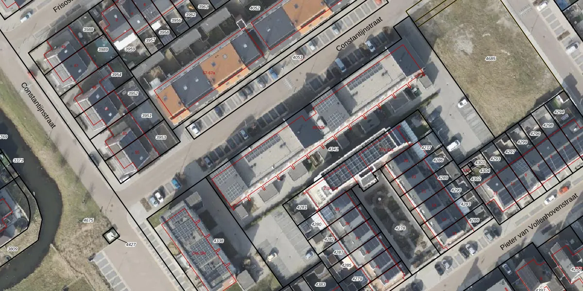 Het perceel waarop Constantijnstraat 38-a staat heeft een oppervlakte van 2840 m². Dit is een zeer groot perceel. De perceeloppervlakte wordt geregistreerd door het Kadaster. Gedetailleerde informatie over de maten van dit perceel kunt u vinden in het rapport Kadastrale kaart met maatvoering van Constantijnstraat 38-a.
