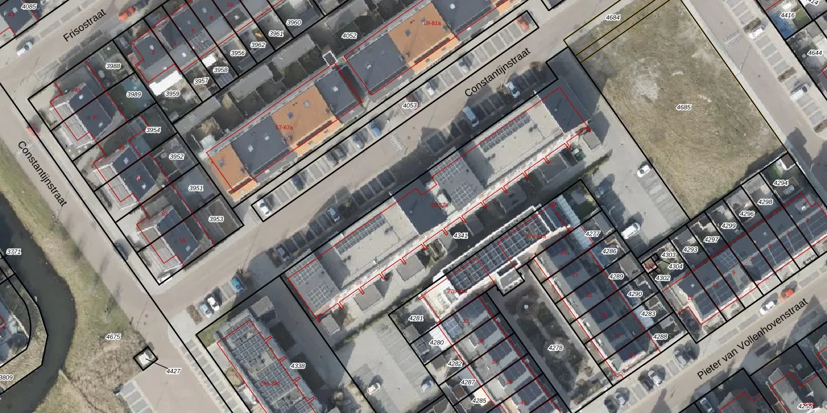 Het perceel waarop Constantijnstraat 40 staat heeft een oppervlakte van 2840 m². Dit is een zeer groot perceel. De perceeloppervlakte wordt geregistreerd door het Kadaster. Gedetailleerde informatie over de maten van dit perceel kunt u vinden in het rapport Kadastrale kaart met maatvoering van Constantijnstraat 40.