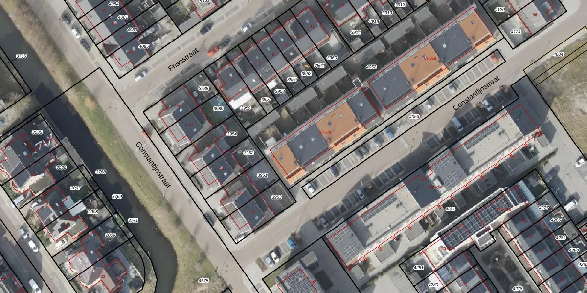 Het perceel waarop Constantijnstraat 59-a staat heeft een oppervlakte van 2265 m². Dit is een zeer groot perceel. De perceeloppervlakte wordt geregistreerd door het Kadaster. Gedetailleerde informatie over de maten van dit perceel kunt u vinden in het rapport Kadastrale kaart met maatvoering van Constantijnstraat 59-a.