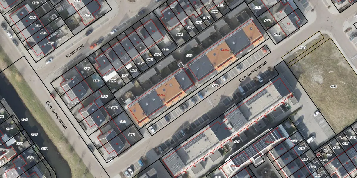 Het perceel waarop Constantijnstraat 67 staat heeft een oppervlakte van 2265 m². Dit is een zeer groot perceel. De perceeloppervlakte wordt geregistreerd door het Kadaster. Gedetailleerde informatie over de maten van dit perceel kunt u vinden in het rapport Kadastrale kaart met maatvoering van Constantijnstraat 67.