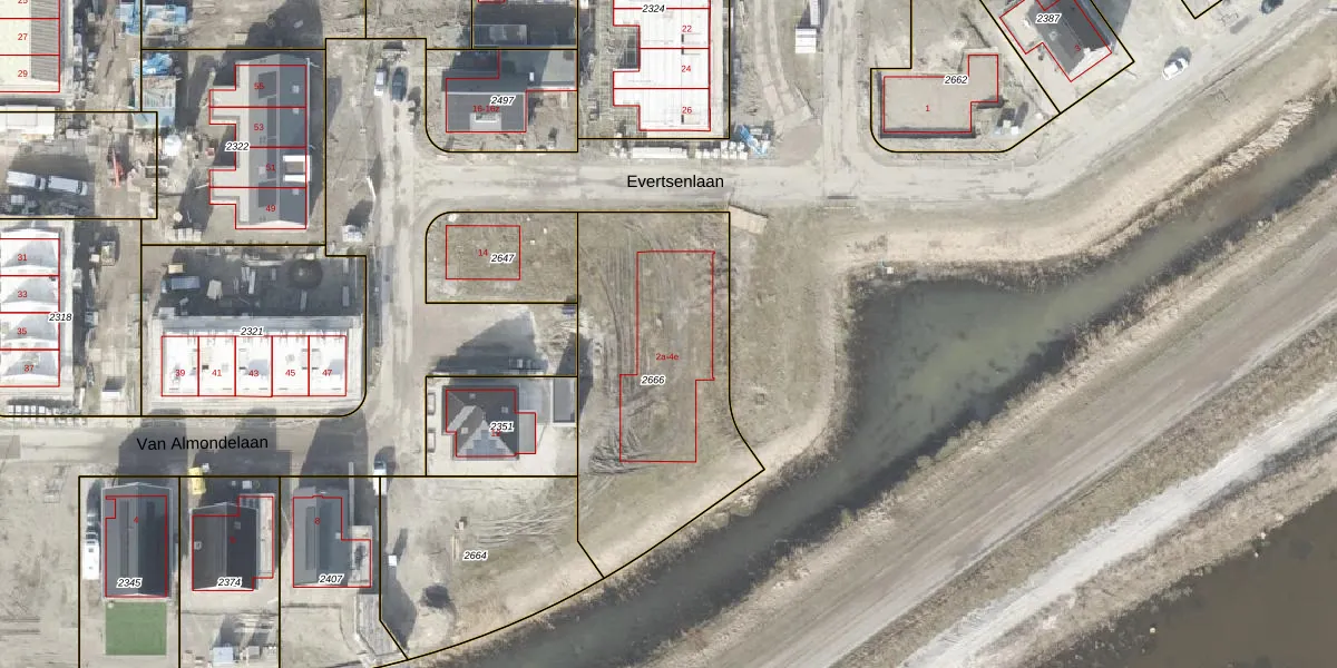 Evertsenlaan 2-b is gelegen op kadastraal perceel URK00D2666. Deze kadastrale aanduiding is uniek en wordt gebruikt door het Kadaster om eigendomsrechten en andere zakelijke rechten vast te leggen. Het perceel maakt onderdeel uit van de kadastrale gemeente Urk.