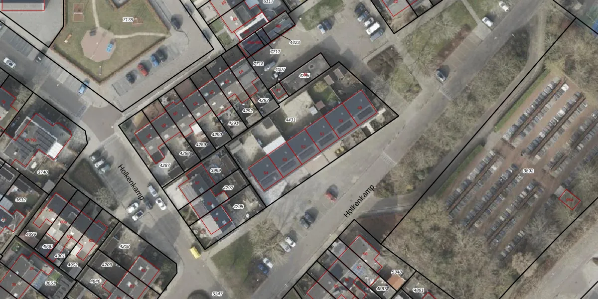 Het perceel waarop Holkenkamp 52 staat heeft een oppervlakte van 1310 m². Dit is een zeer groot perceel. De perceeloppervlakte wordt geregistreerd door het Kadaster. Gedetailleerde informatie over de maten van dit perceel kunt u vinden in het rapport Kadastrale kaart met maatvoering van Holkenkamp 52.