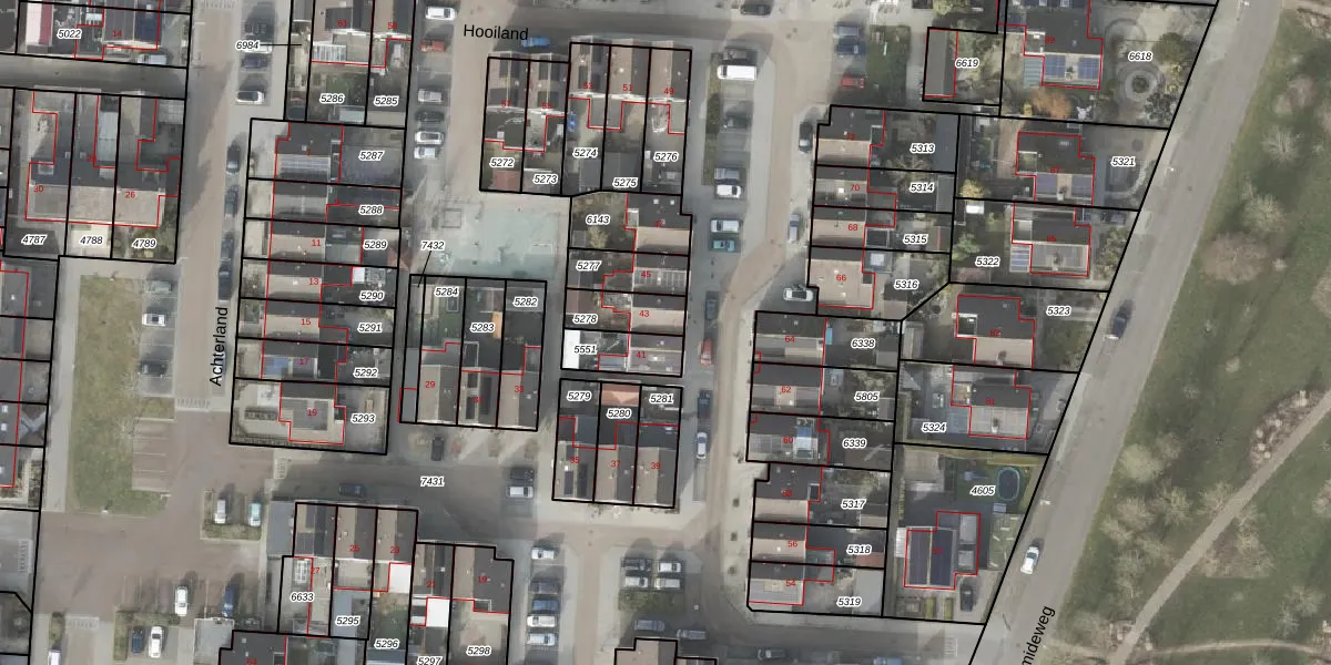 Het perceel waarop Hooiland 43 staat heeft een oppervlakte van 108 m². Dit is een middelgroot perceel. De perceeloppervlakte wordt geregistreerd door het Kadaster. Gedetailleerde informatie over de maten van dit perceel kunt u vinden in het rapport Kadastrale kaart met maatvoering van Hooiland 43.