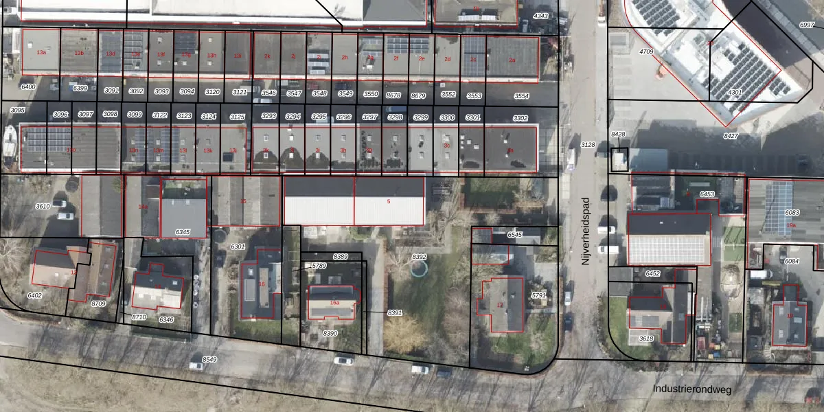 Het perceel waarop Nijverheidspad 5 staat heeft een oppervlakte van 1779 m². Dit is een zeer groot perceel. De perceeloppervlakte wordt geregistreerd door het Kadaster. Gedetailleerde informatie over de maten van dit perceel kunt u vinden in het rapport Kadastrale kaart met maatvoering van Nijverheidspad 5.