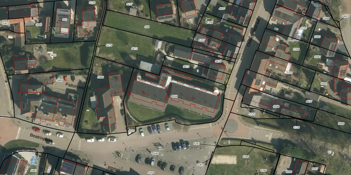 Het perceel waarop Beatrixplein 12 staat heeft een oppervlakte van 1581 m². Dit is een zeer groot perceel. De perceeloppervlakte wordt geregistreerd door het Kadaster. Gedetailleerde informatie over de maten van dit perceel kunt u vinden in het rapport Kadastrale kaart met maatvoering van Beatrixplein 12.