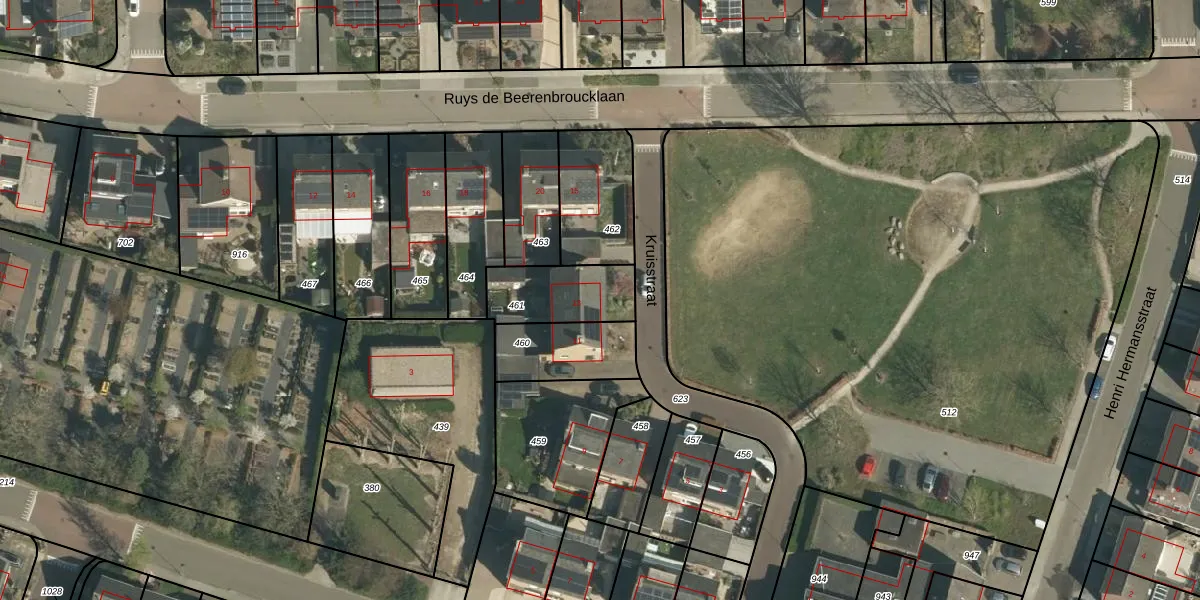 Het perceel waarop Kruisstraat 13 staat heeft een oppervlakte van 235 m². Dit is een middelgroot perceel. De perceeloppervlakte wordt geregistreerd door het Kadaster. Gedetailleerde informatie over de maten van dit perceel kunt u vinden in het rapport Kadastrale kaart met maatvoering van Kruisstraat 13.