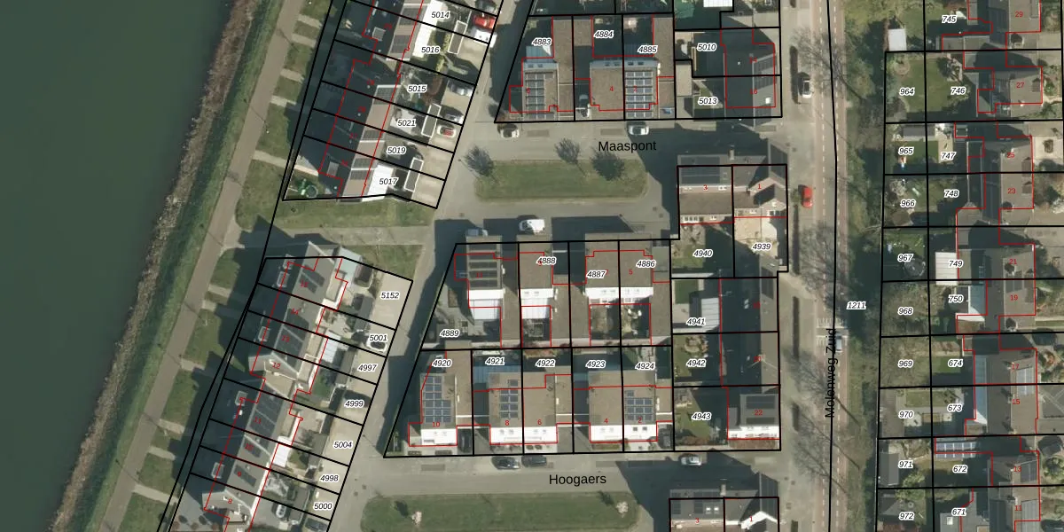 Het perceel waarop Maaspont 9 staat heeft een oppervlakte van 187 m². Dit is een middelgroot perceel. De perceeloppervlakte wordt geregistreerd door het Kadaster. Gedetailleerde informatie over de maten van dit perceel kunt u vinden in het rapport Kadastrale kaart met maatvoering van Maaspont 9.