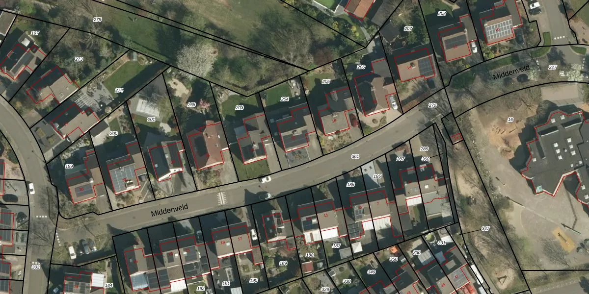 Het perceel waarop Middenveld 20 staat heeft een oppervlakte van 425 m². Dit is een groot perceel. De perceeloppervlakte wordt geregistreerd door het Kadaster. Gedetailleerde informatie over de maten van dit perceel kunt u vinden in het rapport Kadastrale kaart met maatvoering van Middenveld 20.