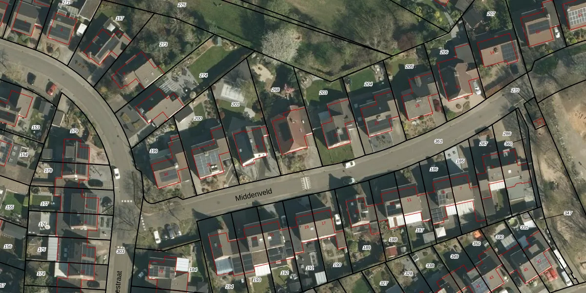 Het perceel waarop Middenveld 24 staat heeft een oppervlakte van 586 m². Dit is een groot perceel. De perceeloppervlakte wordt geregistreerd door het Kadaster. Gedetailleerde informatie over de maten van dit perceel kunt u vinden in het rapport Kadastrale kaart met maatvoering van Middenveld 24.