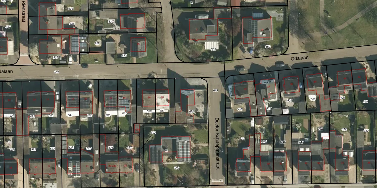 Het perceel waarop Odalaan 30 staat heeft een oppervlakte van 412 m². Dit is een groot perceel. De perceeloppervlakte wordt geregistreerd door het Kadaster. Gedetailleerde informatie over de maten van dit perceel kunt u vinden in het rapport Kadastrale kaart met maatvoering van Odalaan 30.