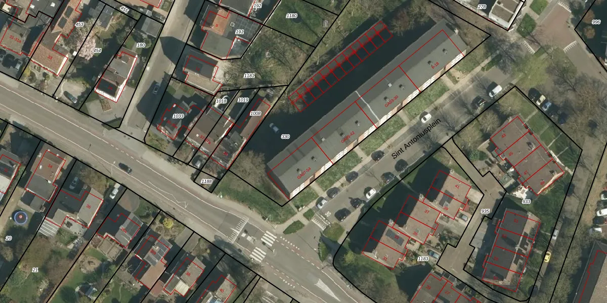 Het perceel waarop Sint Antoniusplein 8-GA07 staat heeft een oppervlakte van 2750 m². Dit is een zeer groot perceel. De perceeloppervlakte wordt geregistreerd door het Kadaster. Gedetailleerde informatie over de maten van dit perceel kunt u vinden in het rapport Kadastrale kaart met maatvoering van Sint Antoniusplein 8-GA07.