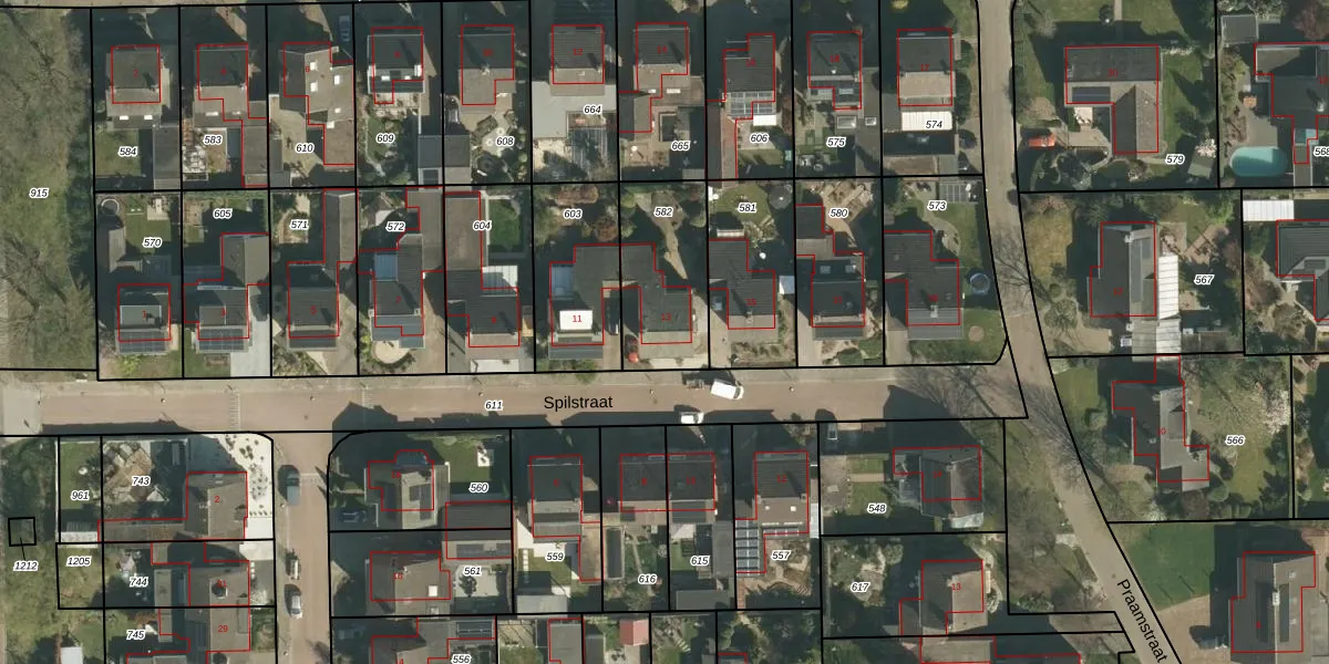 Het perceel waarop Spilstraat 13 staat heeft een oppervlakte van 375 m². Dit is een groot perceel. De perceeloppervlakte wordt geregistreerd door het Kadaster. Gedetailleerde informatie over de maten van dit perceel kunt u vinden in het rapport Kadastrale kaart met maatvoering van Spilstraat 13.