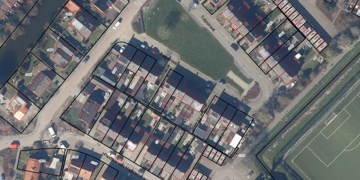 Het perceel waarop Tulpstraat 6 staat heeft een oppervlakte van 4,2 ha. Dit is een zeer groot perceel. De perceeloppervlakte wordt geregistreerd door het Kadaster. Gedetailleerde informatie over de maten van dit perceel kunt u vinden in het rapport Kadastrale kaart met maatvoering van Tulpstraat 6.