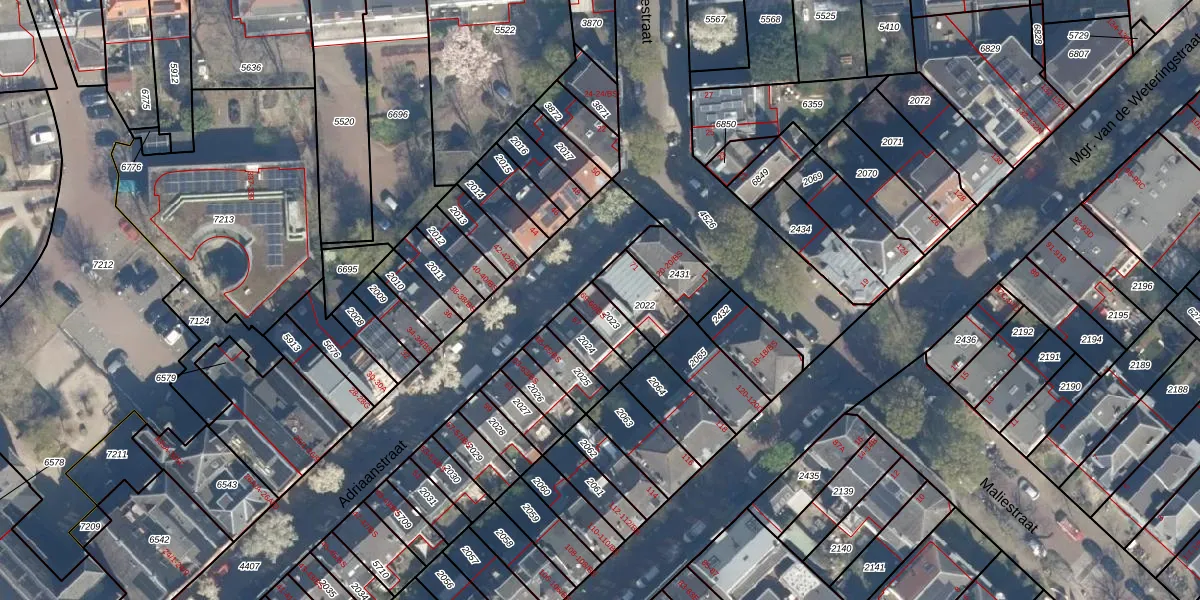 Het perceel waarop Adriaanstraat 69 staat heeft een oppervlakte van 80 m². Dit is een klein perceel. De perceeloppervlakte wordt geregistreerd door het Kadaster. Gedetailleerde informatie over de maten van dit perceel kunt u vinden in het rapport Kadastrale kaart met maatvoering van Adriaanstraat 69.