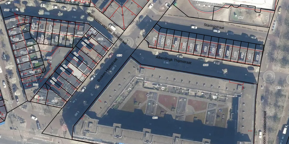 Het perceel waarop Alberdingk Thijmstraat 72 staat heeft een oppervlakte van 6680 m². Dit is een zeer groot perceel. De perceeloppervlakte wordt geregistreerd door het Kadaster. Gedetailleerde informatie over de maten van dit perceel kunt u vinden in het rapport Kadastrale kaart met maatvoering van Alberdingk Thijmstraat 72.