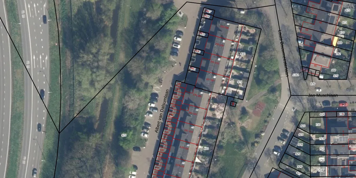 Het perceel waarop Albert van Dalsumlaan 183 staat heeft een oppervlakte van 1915 m². Dit is een zeer groot perceel. De perceeloppervlakte wordt geregistreerd door het Kadaster. Gedetailleerde informatie over de maten van dit perceel kunt u vinden in het rapport Kadastrale kaart met maatvoering van Albert van Dalsumlaan 183.